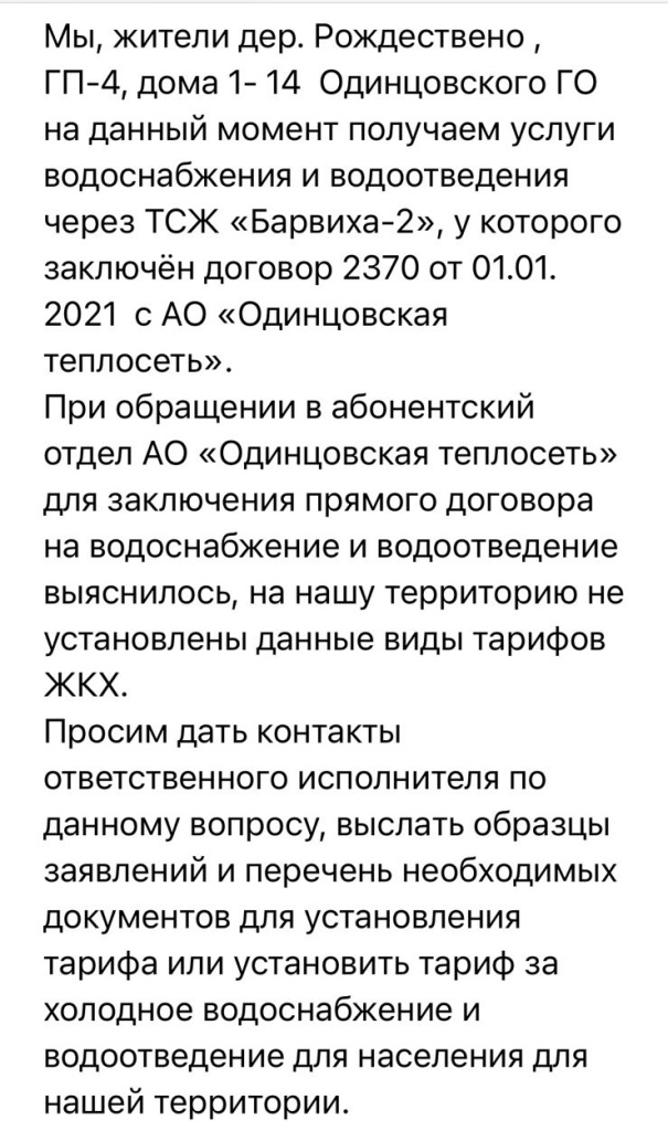 Ответ на обращение по вопросу тарифов на питьевую воду и водоотведение
